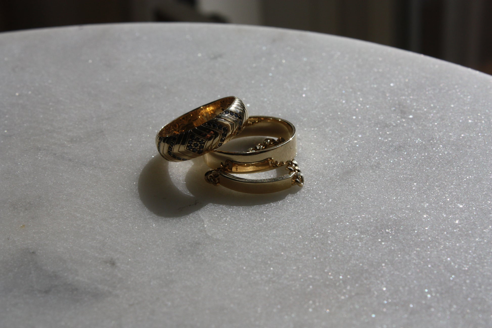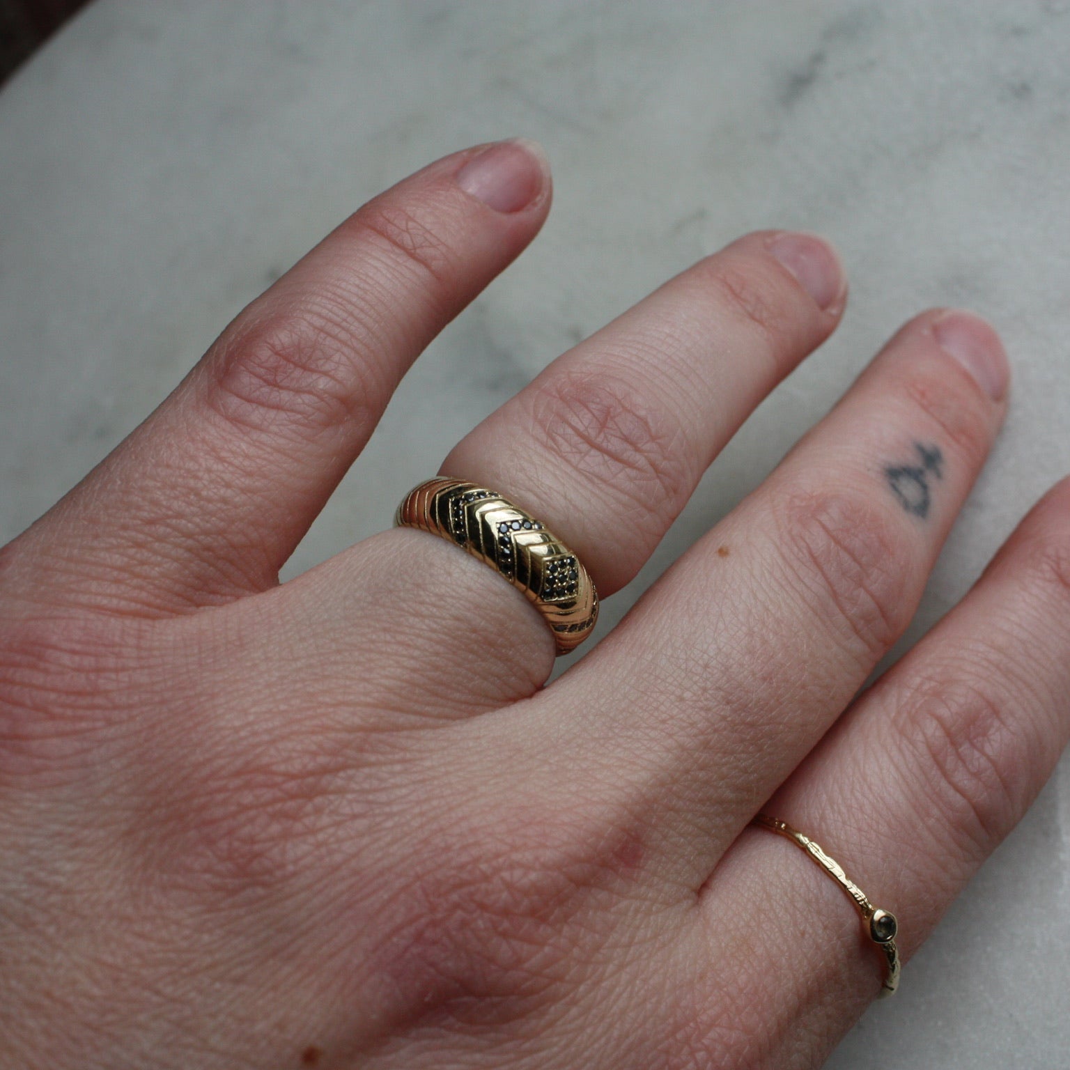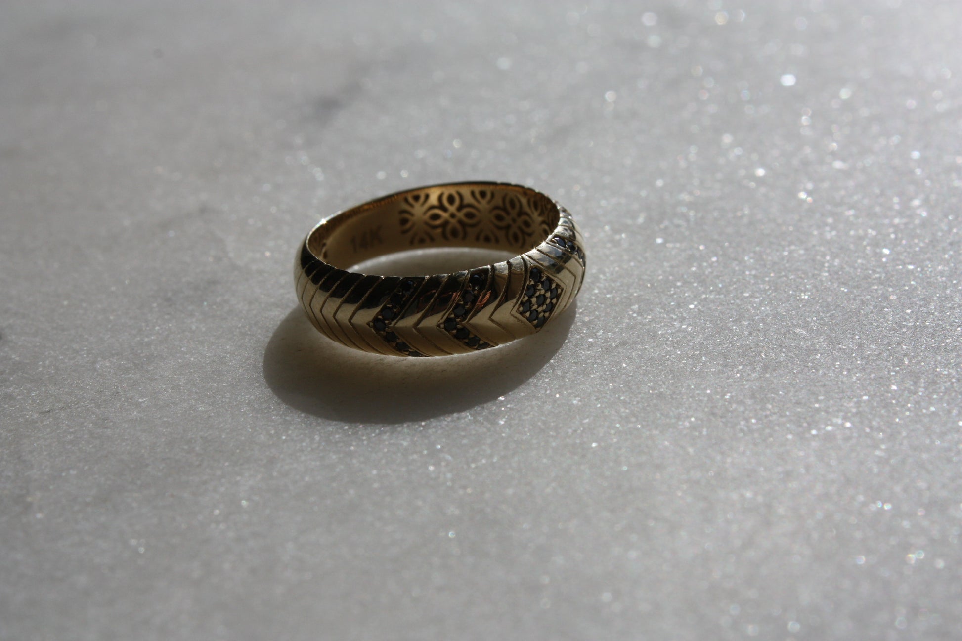 Timeless yet modern, this art deco style dome band features black diamonds set in 14k yellow gold.