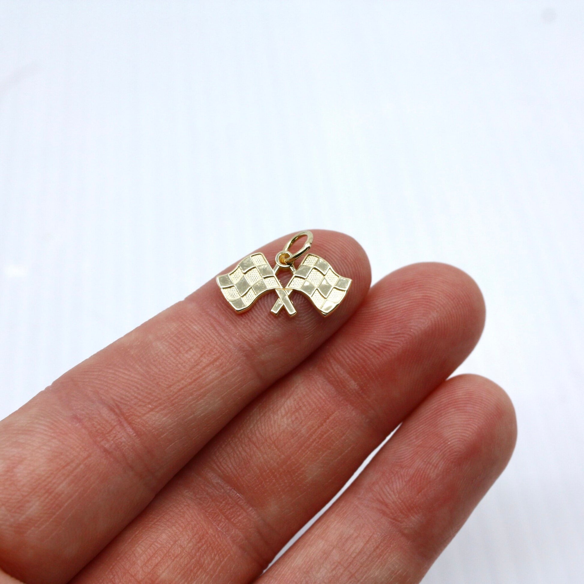 Cross the finish line in style with this 14k solid gold racing flags charm. With your choice of gemstone dangles you can rep your favorite F1 team all season long, or be like Switzerland and keep it neutral with just the flag charm.